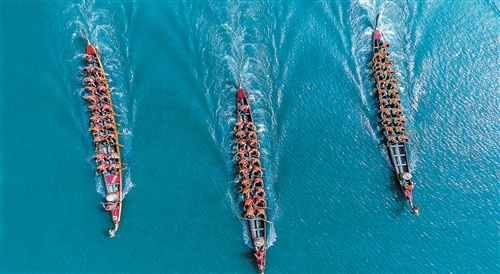 安徽省池州市舉辦的龍舟賽。龍舟競渡是長江流域影響最大、流傳最廣的民俗之一,體現(xiàn)了我國悠久的歷史文化傳承和百舸爭流、勇往直前的競進(jìn)精神。 饒 頤攝