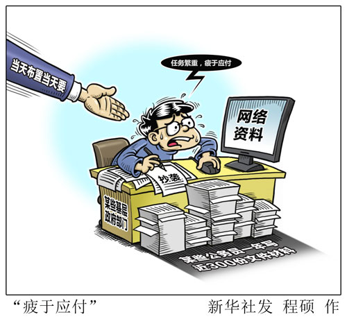 湖北省某縣委政研室干部說,一些黨員干部特別是領導干部能力不濟,把發(fā)文、開會當作抓落實的主要方式方法,甚至將其做成履職盡責、推卸責任的“痕跡”,一些文件層層轉發(fā)、照抄照轉,很多時候并無新的實質性內容,完全是重復上級精神,造成基層干部有看不完的文件、開不完的會。