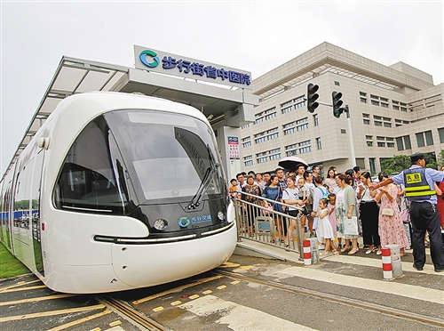 湖北省武漢市省中醫(yī)院門口,乘客在等待有軌電車。近年來,當(dāng)?shù)匕训罔F、有軌電車、公交車和出租車站點安排在離醫(yī)院近的地方,讓百姓方便就醫(yī)。鄭傳海 攝