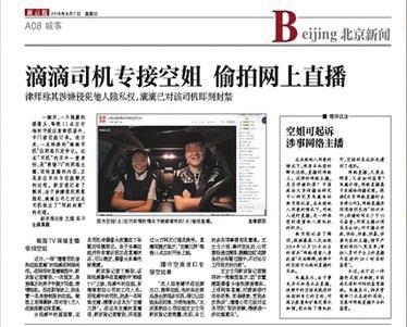 2016年,新京報曾報道過有滴滴司機在“熊貓TV”進行邊開車邊直播的行為。當時,這名滴滴司機在車內(nèi)安裝了一只隱藏的攝像頭,每晚11點左右準時守候在首都機場外,專門接空姐訂單。而他直播的內(nèi)容,正是其在車內(nèi)與空姐聊天的過程。由于直播內(nèi)容涉嫌侵犯乘客隱私,滴滴公司已對這名司機做出了“即刻封禁”的處理,“熊貓TV”平臺也于第一時間對涉事主播做出封停處理,并對事件中的空姐表示歉意。