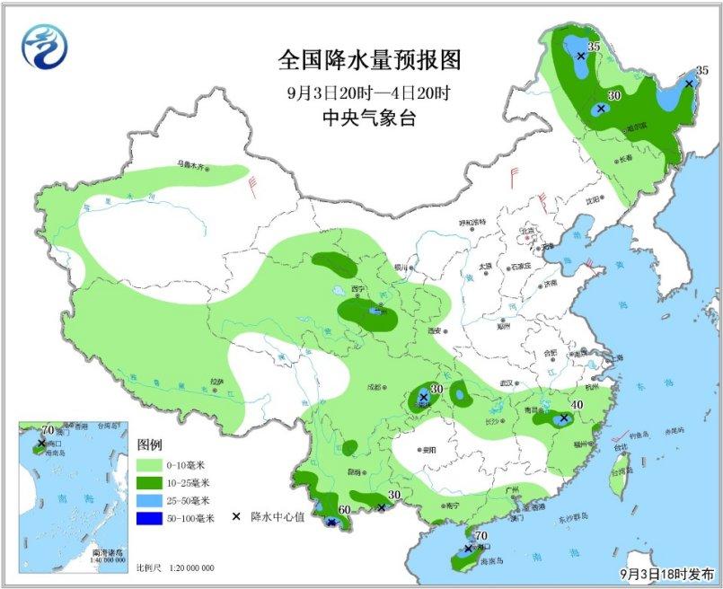 9月3日20時(shí)至4日20時(shí),內(nèi)蒙古東北部、黑龍江大部、甘肅中西部、青海北部和東部以及江南中北部、四川盆地東部和南部、云南西部和南部、廣西南部沿海、海南島和雷州半島等地的部分地區(qū)有中到大雨,局地暴雨;新疆東部、內(nèi)蒙古中東部、遼寧、山東半島有4~6級(jí)風(fēng);黃海中部和南部將有7~8級(jí)、陣風(fēng)9~10級(jí)的風(fēng)(見圖1)。