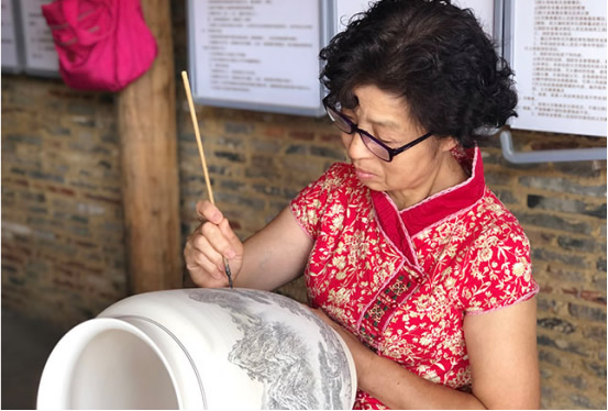 省級非物質(zhì)文化遺產(chǎn)傳承人袁寧霞在陶瓷坯體上描繪紋飾