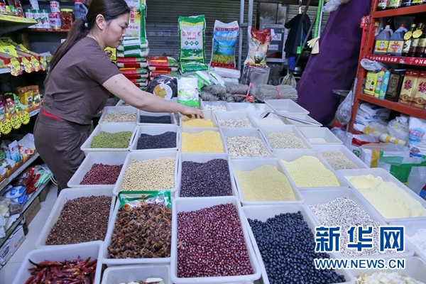 9月10日,商販在江蘇南通一家菜市場五谷雜糧銷售攤位前忙碌。?新華社發(fā)(許叢軍 攝)