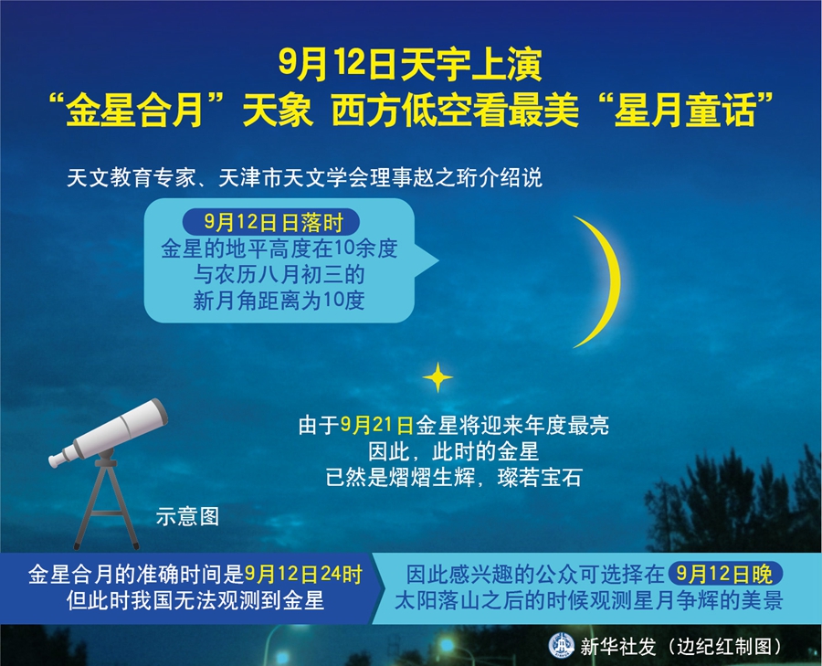 新華社天津9月10日電(記者周潤?。┨煳膶<医榻B說,作為行星合月里最美的一幕“星月童話”,“金星合月”12日晚將現(xiàn)身天宇,映美蒼穹。如果天氣晴好,感興趣的公眾抬頭仰望西方低空,憑借肉眼就可欣賞到“維納斯”與“月姑娘”相依相伴的美妙場(chǎng)景。