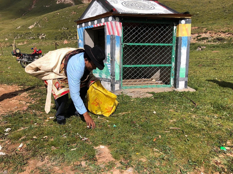 每天早晨9時,雜多縣扎青鄉(xiāng)牧民扎次尼瑪把自家牦牛趕出牛圈來到草場后,就開始了一天巡山的工作。除了對管護區(qū)內(nèi)草原基礎(chǔ)設施進行監(jiān)管、舉報盜采盜獵行為、監(jiān)測草原火情災情以外,“分揀垃圾”也是扎次尼瑪作為“生態(tài)管護員”的工作日常。