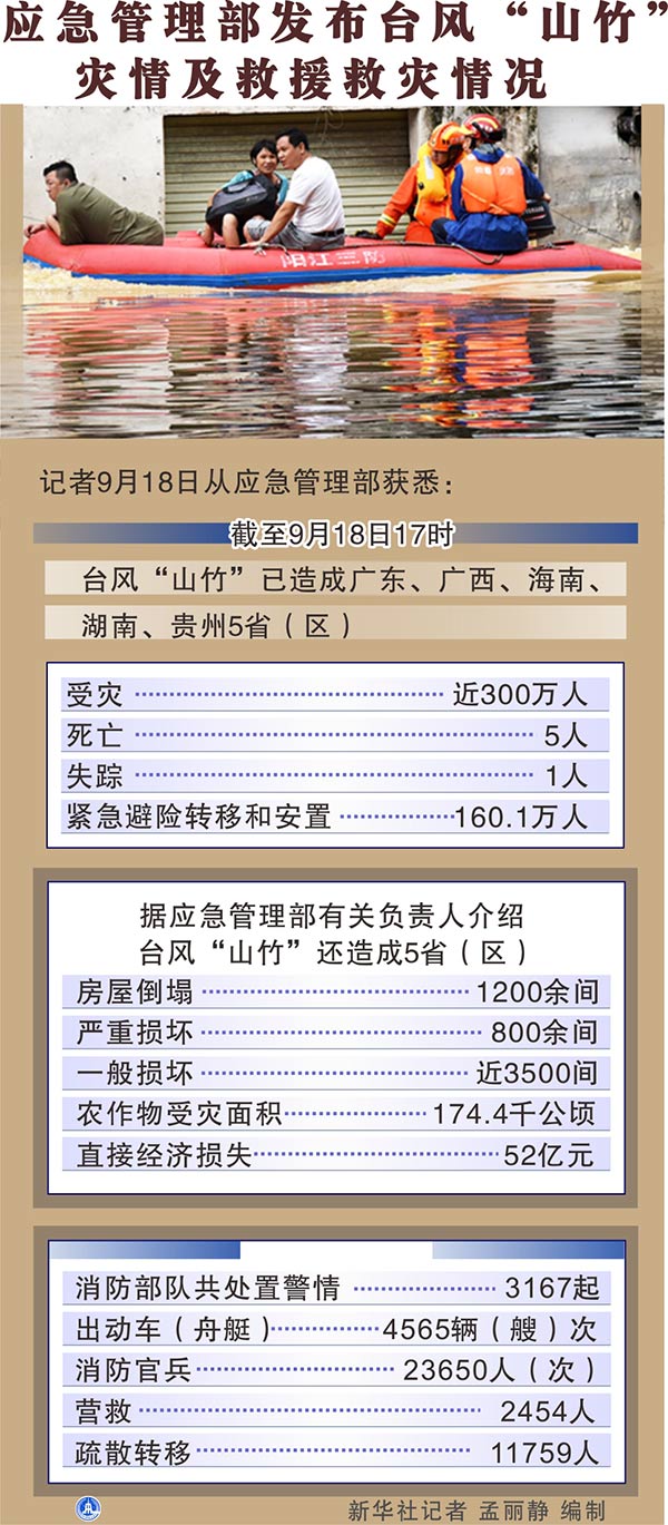 新華社北京9月18日電(記者葉昊鳴)記者18日從應(yīng)急管理部獲悉,截至18日17時,臺風(fēng)“山竹”已造成廣東、廣西、海南、湖南、貴州5省(區(qū))近300萬人受災(zāi),5人死亡,1人失蹤,160.1萬人緊急避險轉(zhuǎn)移和安置。