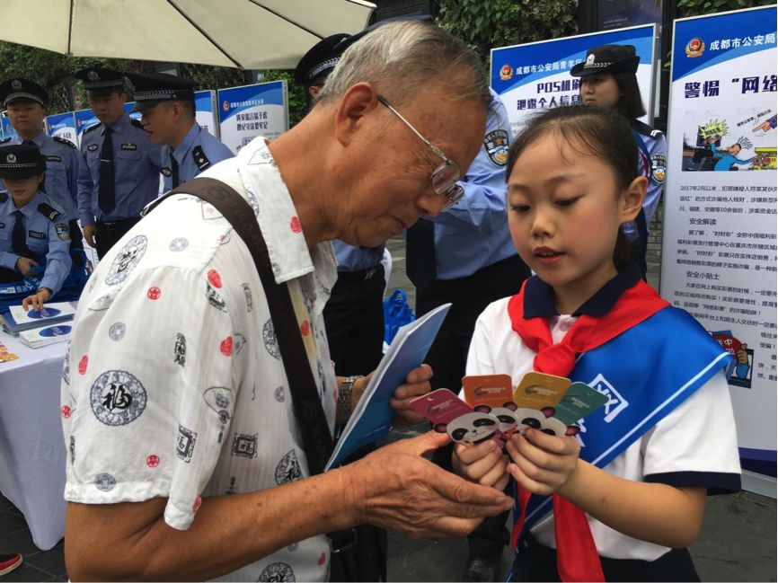 “如果收到信息,說您的家人受傷需要匯款,肯定是詐騙電話??ㄆ竺嬗兴膫€詐騙的典型案例,爺爺您可以了解一下。”少城小學(xué)四年級的李彥孜一邊拿著精巧可愛的網(wǎng)絡(luò)安全知識熊貓書簽,一邊用稚嫩的聲音做介紹。李彥孜是宣傳網(wǎng)絡(luò)安全的小志愿者,她告訴傳播君,這些網(wǎng)絡(luò)安全知識都是用課余時間去了解的,“多一個人知道,就少一個人受害”。