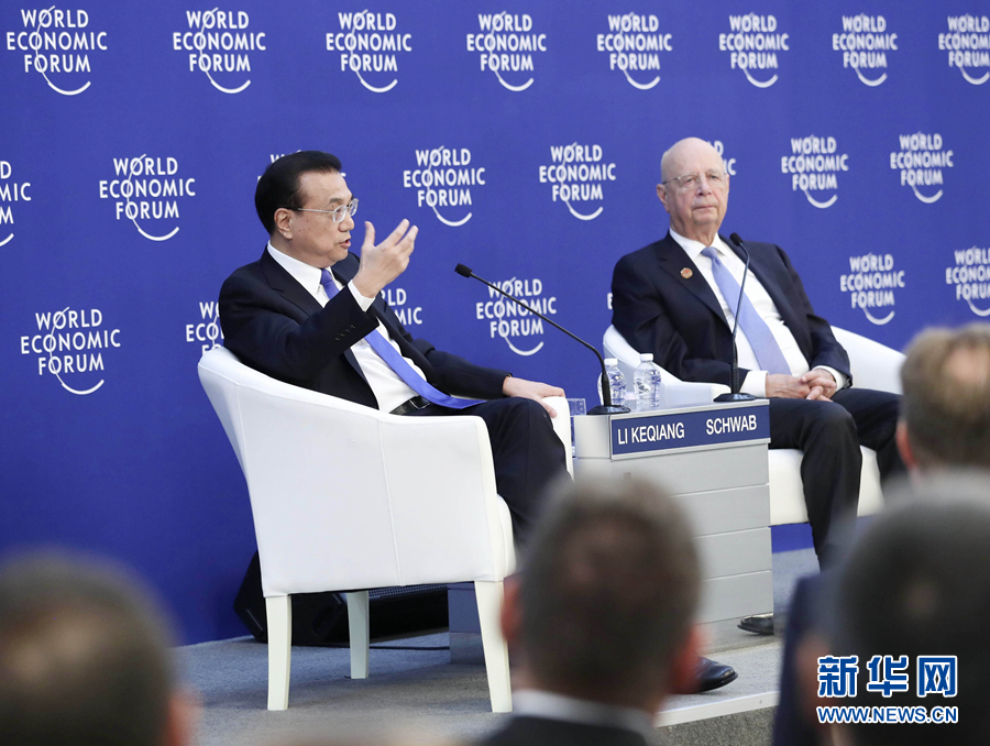 李克強就中國金融開放、知識產(chǎn)權(quán)保護(hù)、減稅降費、創(chuàng)新創(chuàng)業(yè)、世界貿(mào)易體制改革等問題回答了提問。世界經(jīng)濟論壇主席施瓦布主持對話會。來自中國、美國、歐洲、日本等國和地區(qū)200余名代表出席。