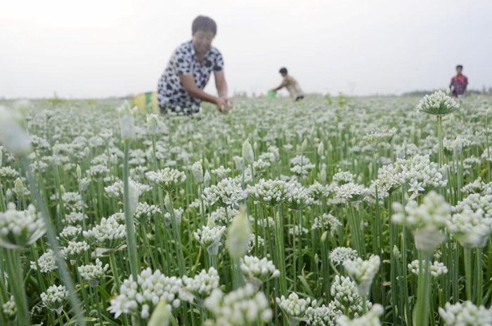 8月28日,在濱城區(qū)三河湖鎮(zhèn)大營(yíng)劉村樂(lè)旋自然蔬菜專業(yè)合作社韭菜基地,村民尹美英在采摘韭花。 新華社發(fā)(李榮新 攝)
