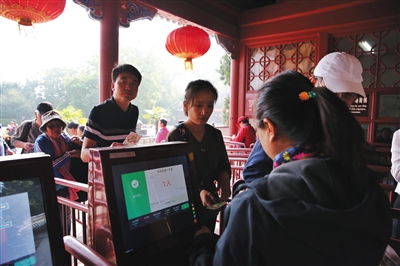 記者從香山公園了解到,國慶期間香山公園實施游客網(wǎng)上預約游覽制度,每日最大售票量7萬張。記者走訪注意到,香山公園門區(qū)已全部更換售驗票系統(tǒng),東門、北門設(shè)置了12臺綜合驗票機,可同時檢驗電子二維碼、紙票二維碼等,游客掃碼、屏幕上出現(xiàn)確認界面后即可入園,耗時僅需1-2秒。(記者周依)