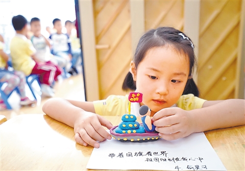 圖⑥ 9月30日,安徽省肥東縣實(shí)驗(yàn)幼兒園御景部開展親子泥塑創(chuàng)意活動,孩子們用彩泥制作國旗慶佳節(jié)。許慶勇 攝