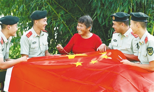 圖⑧ 9月29日,武警安徽總隊(duì)合肥支隊(duì)十七中隊(duì)邀請駐地“兵媽媽”張益蘭到軍營,與官兵一起繡國旗、唱國歌,迎國慶。徐偉 攝
