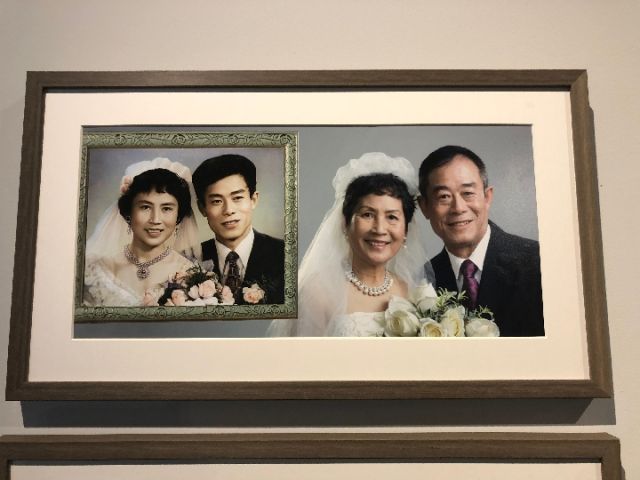 展廳內(nèi)的一幅新舊婚照對比圖引起了觀眾們的注意,作品中左邊的照片是一對新人于1980年拍攝的婚照,右邊是這對夫婦于今年以同樣角度、同款風(fēng)格拍攝的一張婚照。對比之下,雖然曾經(jīng)的“新人”容顏漸老,但幸福依舊。