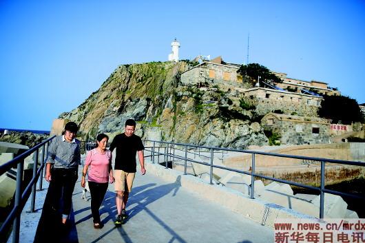 2018年8月8日,王志國(guó)(右)和母親王仕花(中)、姐姐王蘇(左)行走在開(kāi)山島新修建的碼頭上。