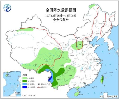 10月12日08時(shí)至13日08時(shí),青藏高原東部等地有小雨(雪)或雨夾雪;甘肅東部、陜西北部、山西中北部、西南地區(qū)大部、廣西西部、臺(tái)灣島和海南島等地部分地區(qū)有小到中雨,其中,西藏東南部和云南西部等地局地有大雨或暴雨(50~80毫米)。臺(tái)灣海峽將有7~8級(jí)、陣風(fēng)9級(jí)減弱為6~7級(jí)、陣風(fēng)8級(jí)的東北風(fēng)。