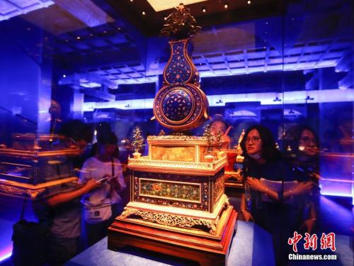 “紫禁城與‘海上絲綢之路’”展上的故宮古鐘表。中新社記者 杜洋 攝