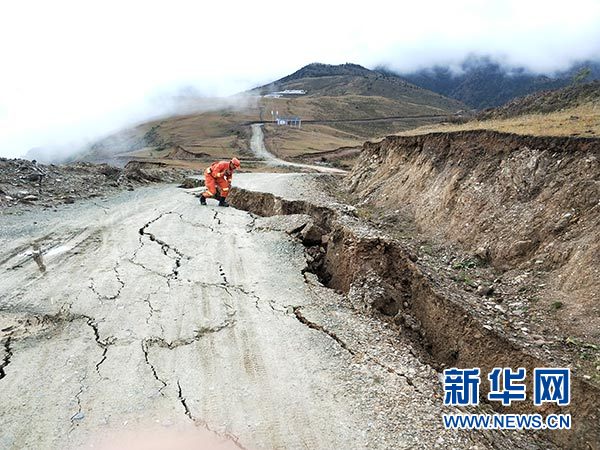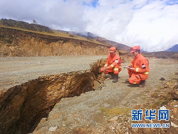 先遣隊員在波公村勘察地質(zhì)災(zāi)害情況(10月13日攝)。 新華社發(fā)(夏能 攝)