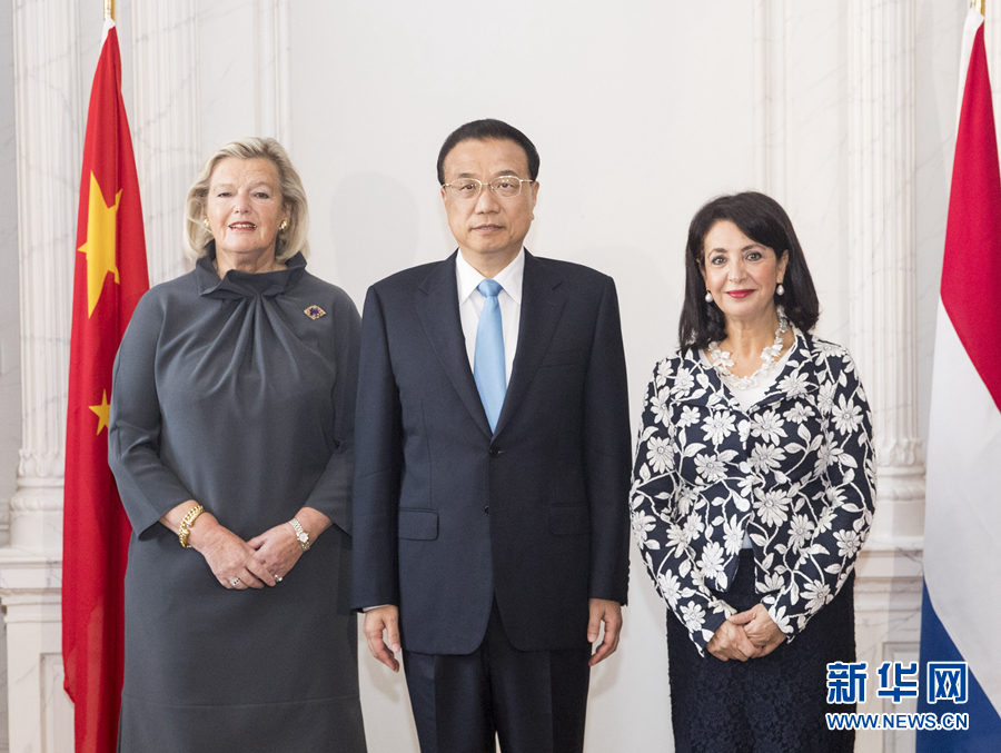 當?shù)貢r間10月16日上午,國務院總理李克強在荷蘭議會大廈會見荷蘭議會兩院議長安吉·布魯克斯-克諾爾(左)和哈蒂亞·阿瑞布(右)。 新華社記者 王曄 攝