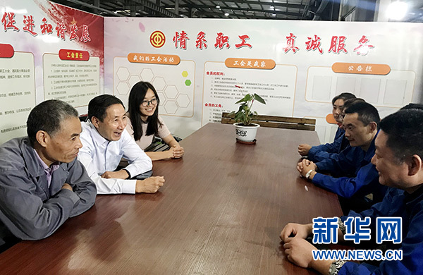 吳振祥(左二)走訪企業(yè),在車間“職工之家”與一線職工交流(資料照片)。 新華社發(fā)