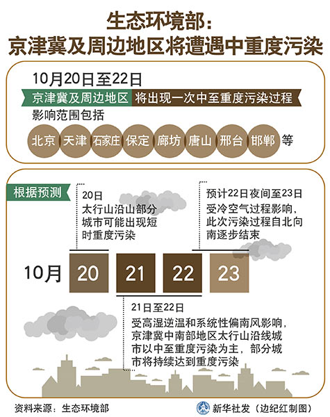 新華社北京10月19日電(記者高敬)記者從生態(tài)環(huán)境部獲悉,10月20日至22日,京津冀及周邊地區(qū)將出現一次中至重度污染過程,影響范圍包括北京、天津、石家莊、保定、廊坊、唐山、邢臺和邯鄲市等。