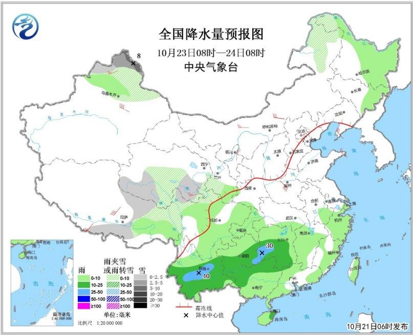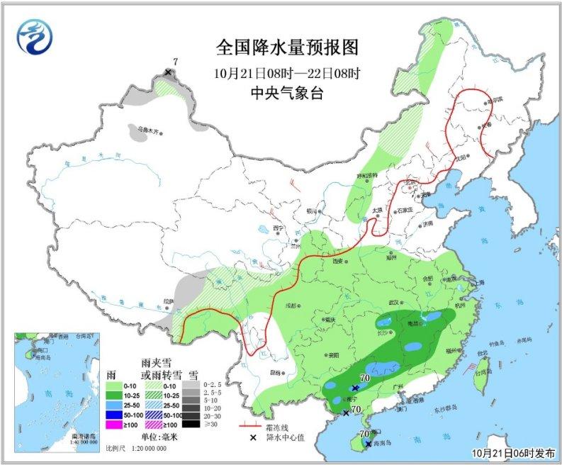 10月21日08時(shí)至22日08時(shí),新疆塔城和阿勒泰地區(qū)、內(nèi)蒙古東部、青海南部、西藏東部、川西高原北部等地的部分地區(qū)有小到中雪或雨夾雪,其中阿勒泰北部局地有大雪。江南中西部、華南西部和北部、海南島中東部等地有中到大雨,其中廣西中部和南部沿海、海南島東南部等地的局部地區(qū)有暴雨(50~70毫米)。內(nèi)蒙古西部、甘肅中部有4~5級(jí)偏北風(fēng)(見圖1)。