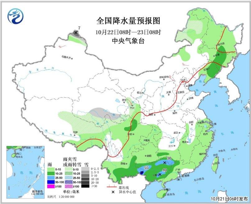 10月22日08時(shí)至23日08時(shí),新疆阿勒泰地區(qū)、內(nèi)蒙古東北部、西藏東部、青海南部、甘肅中部、川西高原北部等地部分地區(qū)有小雪或雨夾雪,其中,阿勒泰北部局地有大雪(5~7毫米)。吉林東部、遼寧東部、云南東部、四川盆地西北部、廣西大部和廣東西部等地部分地區(qū)有中到大雨,其中,云南東南部和廣西西南部等地的局部地區(qū)有暴雨(50~55毫米)。新疆北部、甘肅中部、內(nèi)蒙古中東部和遼寧中部等地部分地區(qū)有4~6級(jí)風(fēng)(見圖2)。