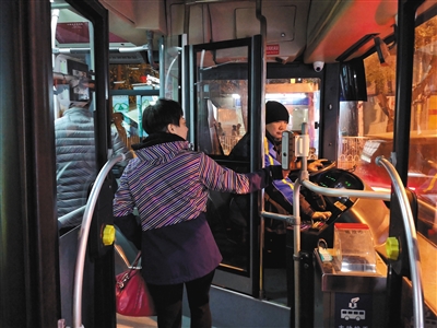 11月10日晚間,西單北大街,一輛已安裝安全隔離門的公交車??吭谡九_。新京報(bào)記者 裴劍飛 攝