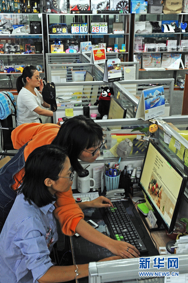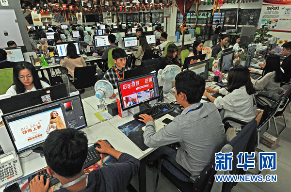 義烏市一家電商服務(wù)企業(yè)的員工在為電商平臺(tái)運(yùn)營而忙碌(10月25日攝)。新華社記者 譚進(jìn) 攝