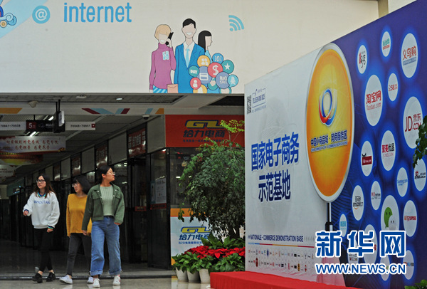 義烏電商企業(yè)的員工從國家電子商務(wù)示范基地的標(biāo)識(shí)板旁走過(10月31日攝)。新華社記者 譚進(jìn) 攝