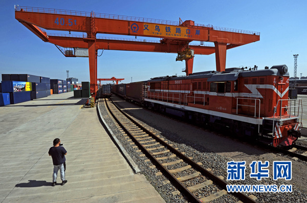 在義烏鐵路西站,一列駛往西班牙馬德里的中歐班列(義烏)緩緩發(fā)車(10月27日攝)。新華社記者 譚進(jìn) 攝