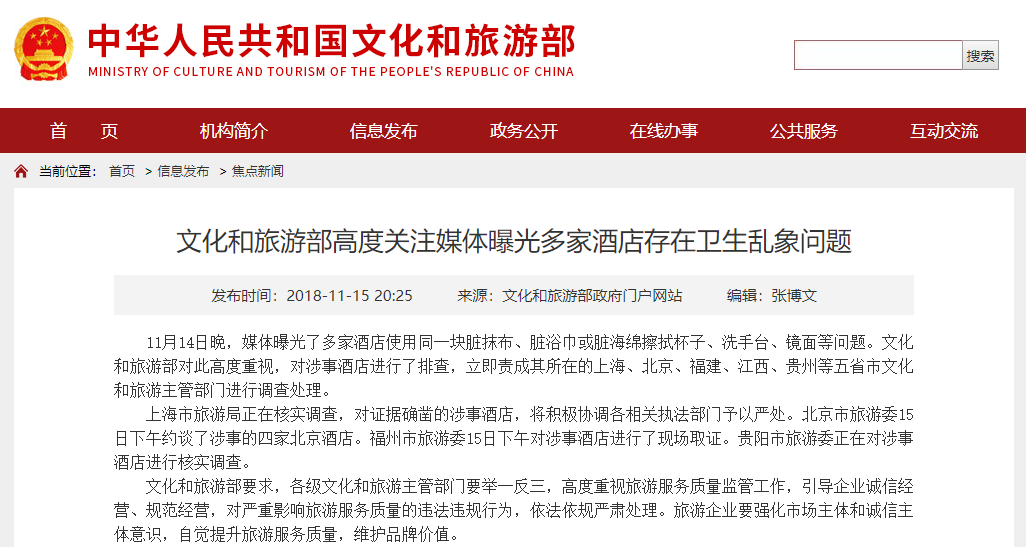 回應(yīng)稱,11月14日晚,媒體曝光了多家酒店使用同一塊臟抹布、臟浴巾或臟海綿擦拭杯子、洗手臺、鏡面等問題。文化和旅游部對此高度重視,對涉事酒店進行了排查,立即責成其所在的上海、北京、福建、江西、貴州等五省市文化和旅游主管部門進行調(diào)查處理。