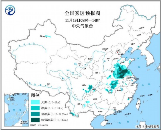 中央氣象臺11月19日08時發(fā)布大霧黃色預(yù)警: