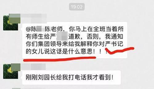 隨后,群內(nèi)署名為“嚴某某媽媽”的人士發(fā)言稱,“陳老師,你馬上在全班當(dāng)著所有師生給嚴某某道歉,否則,我通知你們集團領(lǐng)導(dǎo)來給我解釋你對嚴書記的女兒說這話是什么意思!”后又稱學(xué)校已將該老師開除。