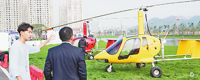 工作人員向觀眾介紹一款可搭載測繪儀器的自動(dòng)旋翼機(jī)。新華社發(fā)