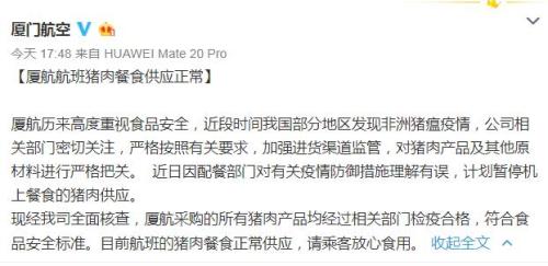 廈航稱,廈航歷來(lái)高度重視食品安全,近段時(shí)間中國(guó)部分地區(qū)發(fā)現(xiàn)非洲豬瘟疫情,公司相關(guān)部門密切關(guān)注,嚴(yán)格按照有關(guān)要求,加強(qiáng)進(jìn)貨渠道監(jiān)管,對(duì)豬肉產(chǎn)品及其他原材料進(jìn)行嚴(yán)格把關(guān)。近日,因配餐部門對(duì)有關(guān)疫情防御措施理解有誤,計(jì)劃暫停機(jī)上餐食的豬肉供應(yīng)。