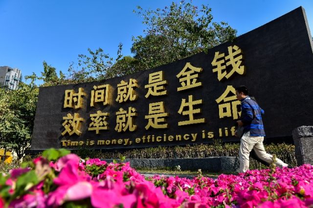 圖為“時(shí)間就是金錢,效率就是生命”紀(jì)念牌,目前位于廣東省自貿(mào)區(qū)深圳前海蛇口片區(qū)。新華社記者 毛思倩 攝