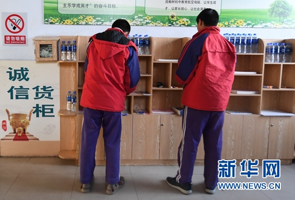 11月30日,在吉林省榆樹(shù)市五棵樹(shù)鎮(zhèn)中學(xué),學(xué)生們?cè)凇罢\(chéng)信貨柜”選購(gòu)商品。新華社記者 張楠攝