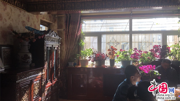尕瑪文索的新家在統(tǒng)建區(qū)的一棟居民樓內(nèi),房間里擺滿了藏族特色的家具和裝飾品,各種花朵盆栽占據(jù)了整個(gè)陽臺(tái)?!靶路孔拥亩旌拖奶煲粯优?,花可以繼續(xù)長,什么植物都可以養(yǎng)?!薄芭汀背闪随噩斘乃鲗?duì)新房子最大的印象。
