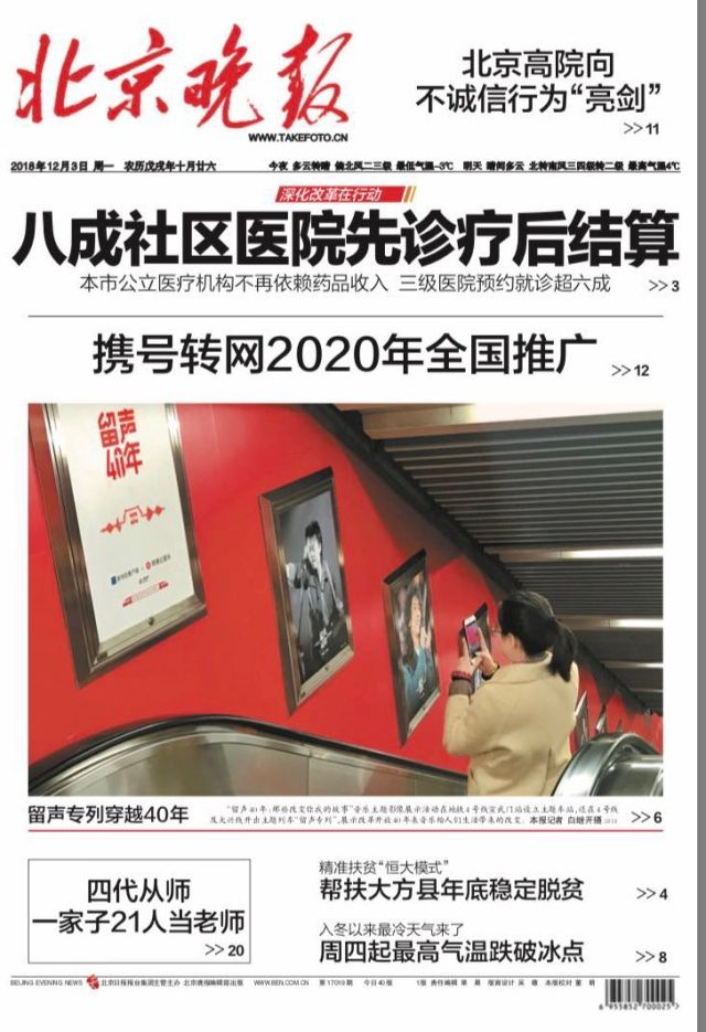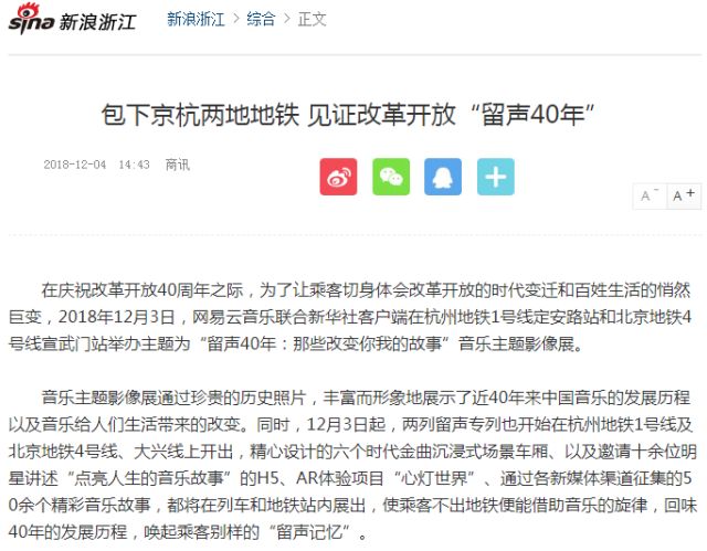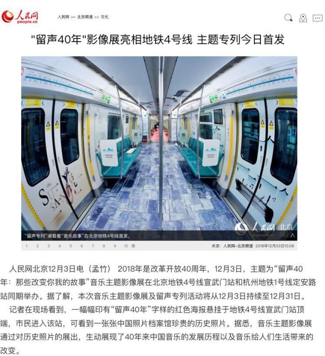 新華社北京12月4日電(記者 牧小湘)為慶祝改革開放40周年,新華社客戶端與網(wǎng)易云音樂、京港地鐵聯(lián)合舉辦的“留聲40年:那些改變你我的故事”音樂主題影像展12月3日亮相北京地鐵4號線宣武門站及杭州地鐵1號線定安路站。