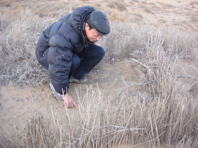 劉永定在沙漠調(diào)查藻類生物結(jié)皮。(受訪者供圖)