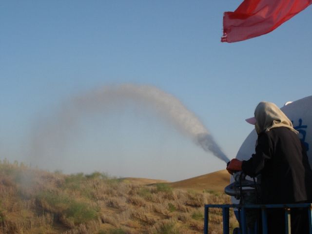 治沙人員向荒漠中噴灑藻類。(受訪者供圖)