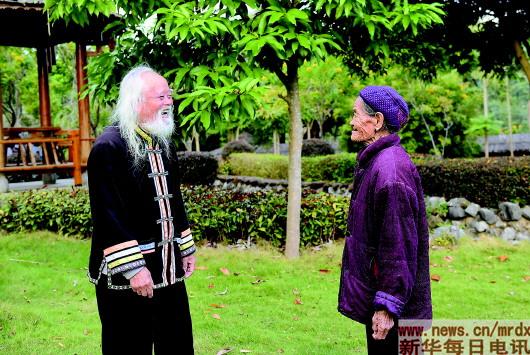 在廣西巴馬瑤族自治縣長(zhǎng)壽島,98歲的長(zhǎng)壽老人羅耀斌(左)在和一名老人交談(11月8日攝)。 新華社記者陸波岸攝