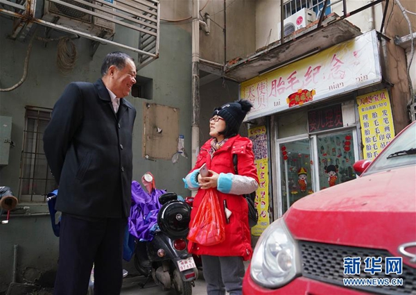 12月24日,邱娥國(左)在南昌市象山社區(qū)向一位百姓了解社區(qū)的最新情況。 新華社記者 胡晨歡 攝