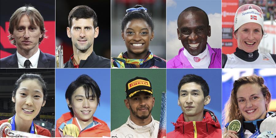 拼版照片上排從左至右為:盧卡·莫德里奇、諾瓦克·焦科維奇、西蒙·拜爾斯、埃魯?shù)隆せ諉谈?、比約根;下排從左至右為:朱婷、羽生結弦、劉易斯·漢密爾頓、武大靖、霍蘇。 新華社發(fā)