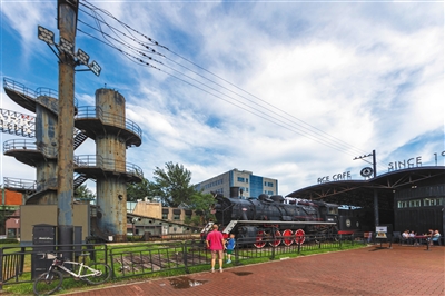 12月下旬,798藝術(shù)區(qū)內(nèi)游人不多,一些游客在798創(chuàng)意廣場(chǎng)30米長(zhǎng)的涂鴉墻前拍照,工廠時(shí)期的輪碾機(jī)被做成路標(biāo)、石臺(tái),隨處可見(jiàn)。銹跡斑斑的機(jī)器、鋼管鐵道、高高的煙囪與先鋒藝術(shù)雕塑和畫(huà)作共生,游客們穿梭于傳統(tǒng)工業(yè)與現(xiàn)代藝術(shù)之間。