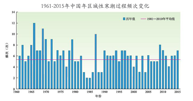 1961-2015年中國年區(qū)域性寒潮過程頻次變化 圖片數(shù)據(jù)來源:國家氣候中心