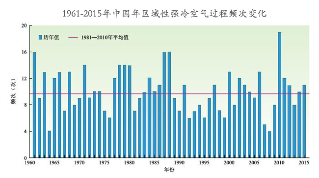 1961-2015年中國年區(qū)域性強冷空氣過程頻次變化 圖片數(shù)據(jù)來源:國家氣候中心