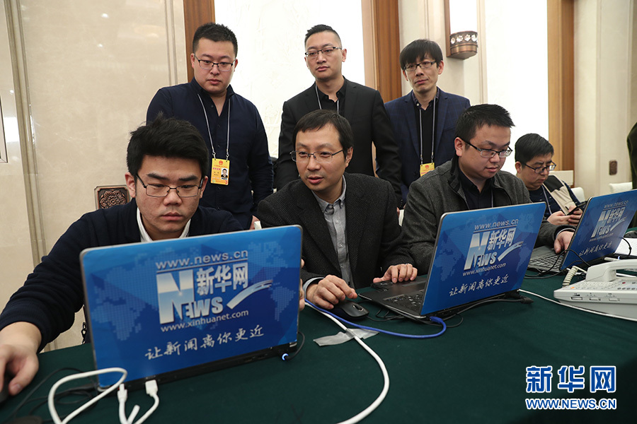 全國政協(xié)十三屆一次會議新聞發(fā)布會3月2日16:30在人民大會堂一層新聞發(fā)布廳召開,大會新聞發(fā)言人王國慶向中外媒體介紹本次大會有關(guān)情況并回答記者提問。圖為發(fā)布會前新華網(wǎng)直播團隊進行準備工作。新華網(wǎng)/中國政府網(wǎng) 翟子赫攝
