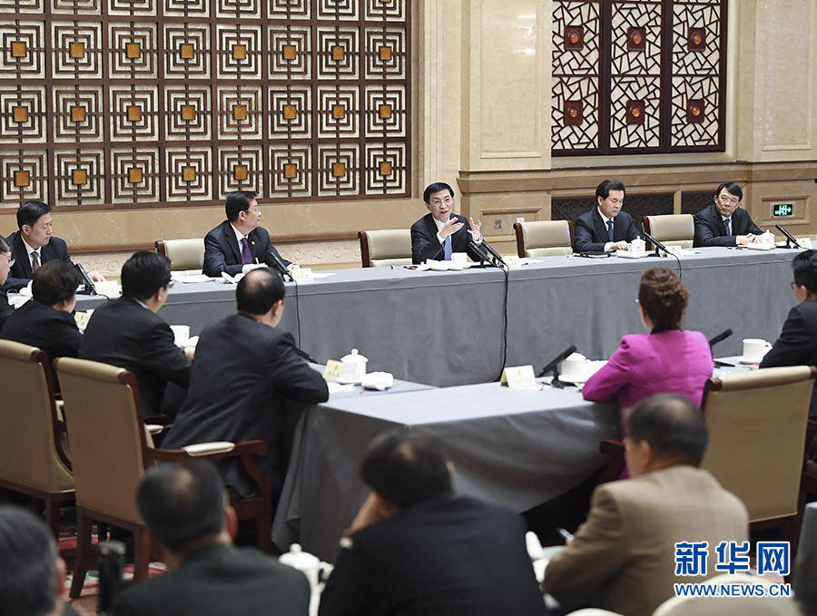 3月4日,中共中央政治局常委栗戰(zhàn)書看望出席全國政協(xié)十三屆一次會議的民建、九三學(xué)社界委員并參加討論。 新華社記者 劉衛(wèi)兵 攝