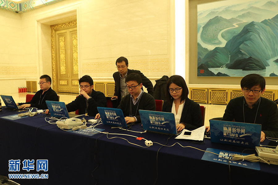 民主黨派中央和全國工商聯(lián)領(lǐng)導(dǎo)人記者會3月6日下午在人民大會堂金色大廳舉行,邀請民革中央主席萬鄂湘、民盟中央主席丁仲禮、民建中央主席郝明金、民進中央主席蔡達峰、農(nóng)工黨中央主席陳竺、致公黨中央主席萬鋼、九三學(xué)社中央主席武維華、臺盟中央主席蘇輝、全國工商聯(lián)主席高云龍回答記者提問。圖為現(xiàn)場直播團隊正在進行準(zhǔn)備工作。新華網(wǎng)/中國政府網(wǎng) 陳杰 攝